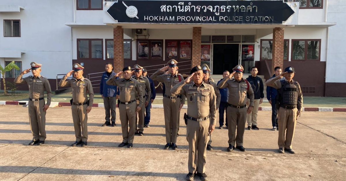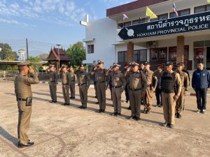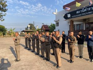 นำข้าราชการตำรวจ สภ.หอคำ เข้าแถวเคารพธงชาติ สวดมนตร์ไหว้พระ ท่องคำสัตย์ปฏิญาณ อุดมคติตำรวจ ตรวจทรงผม เครื่องแบบ เครื่องแต่งกาย มอบนโยบายและข้อสั่งการของผู้บังคับบัญชา และปล่อยแถวออกปฏิบัติหน้าที่ต่อไป