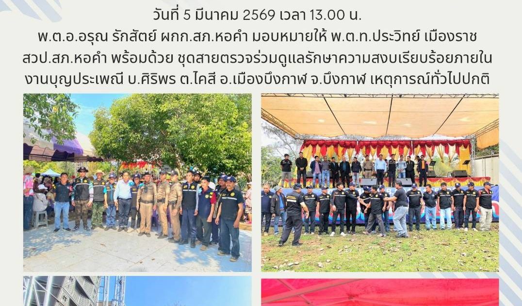 ร่วมกิจกรรมกับชุมชน รปภ.งานบุญประเพณี 17 มีนาคม 2026 โดย admin / ภารกิจผู้บังคับบัญชา และข้าราชการตำรวจ วันที่ 5 มี.ค. 2569 เวลา 13.00 น พ.ต.ท.ประวิทย์ เมืองราช สวป.สภ.หอคำ ปฏิบัติหน้าที่ร้อยเวร 20 พร้อมด้วย สายตรวจ/จราจร ร่วมด้วย ผู้นำชุมชน ชรบ.ไคสี รักษาความสงบเรียบร้อยภายในงานบุญประเพณี บ.ศิริพร ต.ไคสี เหตุการณ์ทั่วไปปกติ