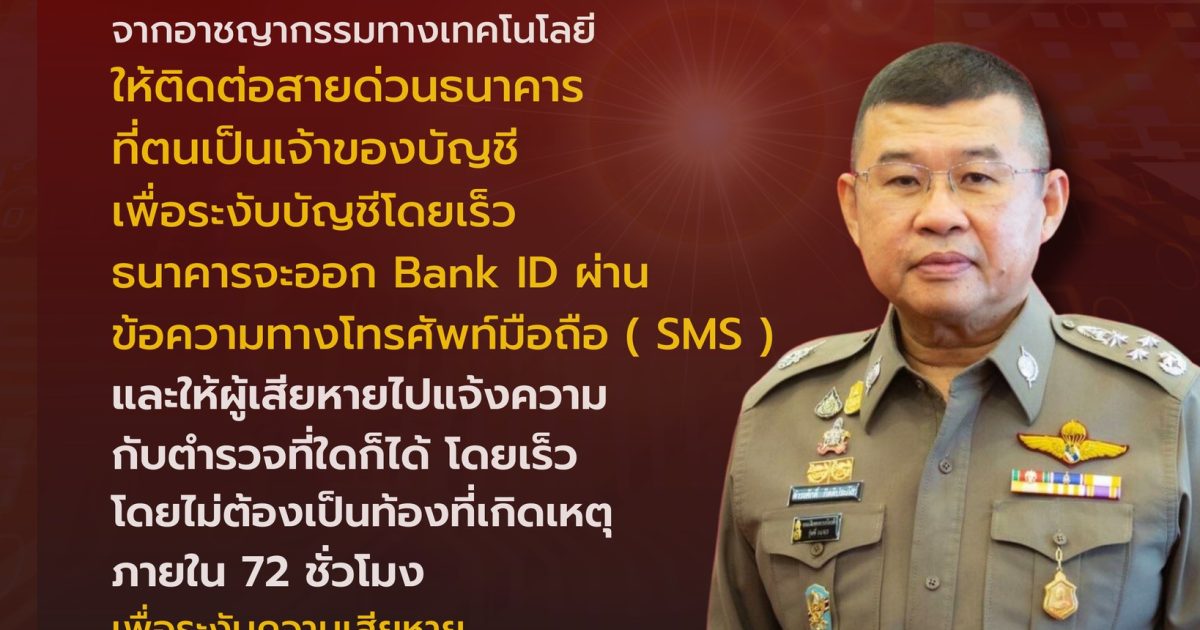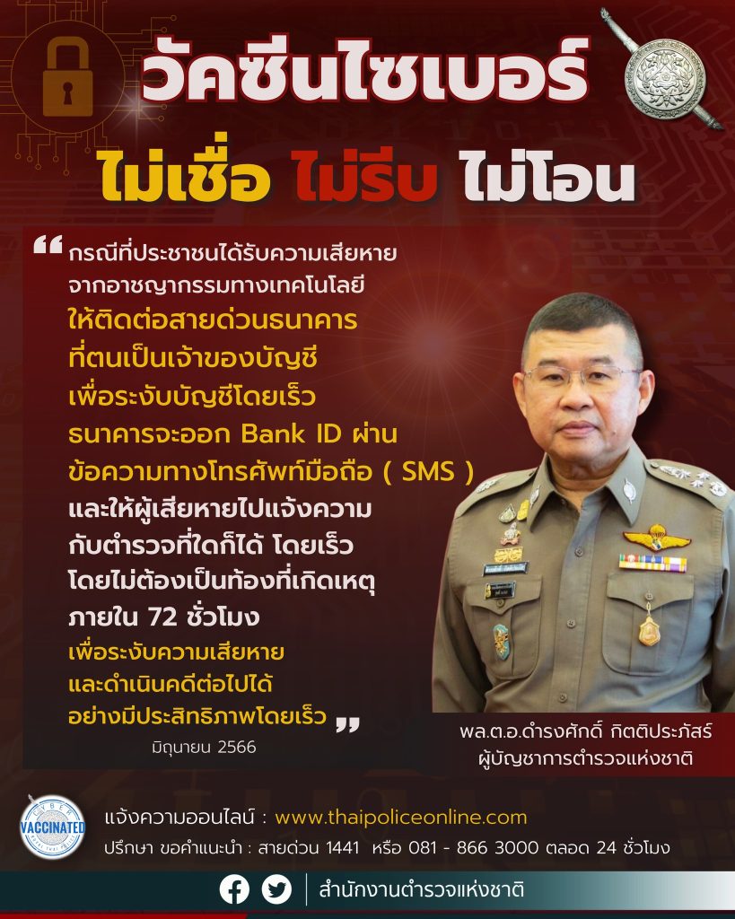 “กรณีที่ประชาชนได้รับความเสียหายจากอาชญากรรมทางเทคโนโลยี ให้ติดต่อสายด่วนธนาคารที่ตนเป็นเจ้าของบัญชี เพื่อระงับบัญชีโดยเร็ว ธนาคารจะออก Bank ID ผ่านข้อความทางโทรศัพท์มือถือ ( SMS ) และให้ผู้เสียหายไปแจ้งความกับตำรวจที่ใดก็ได้โดยเร็ว โดยไม่ต้องเป็นท้องที่เกิดเหตุ ภายใน 72 ชั่วโมง เพื่อระงับความเสียหาย และดำเนินคดีต่อไปได้อย่างมีประสิทธิภาพโดยเร็ว” พล.ต.อ.ดำรงศักดิ์ กิตติประภัสร์ ผบ.ตร.